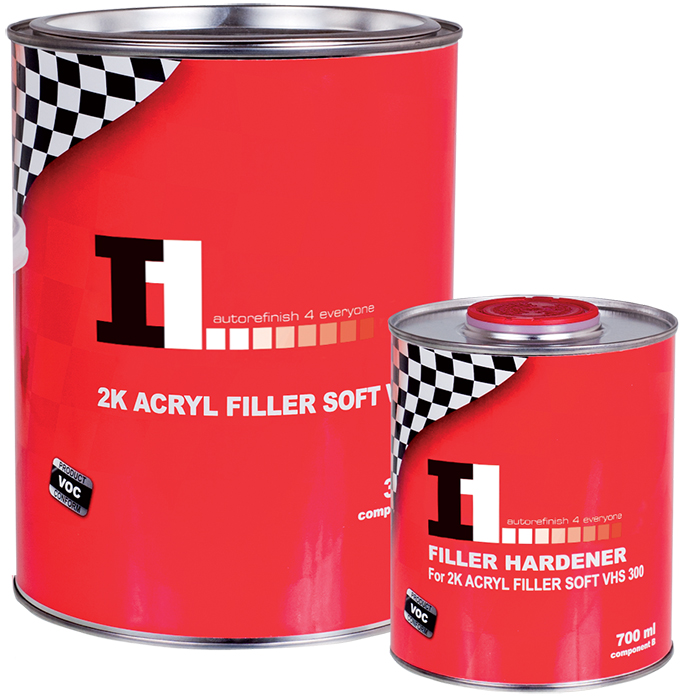 Akrylátový šedý plnič 2K Acryl filler Soft VHS 300 je charakteristický vysokým stupněm plnění. Aplikuje se ve 2-4 silných vrstvách a vzhledem k velmi dobré vyrovnávací schopnosti nezpůsobuje problémy při broušení. Tixotropní vlastnosti, vysoká plnící schopnost, krátký čas schnutí a snadné broušení dovolují použít plnič Soft VHS 300 i jako náhradu stříkacího tmelu. Tato přednost umožňuje zkrátit proces opravy a snížit i její náklady.